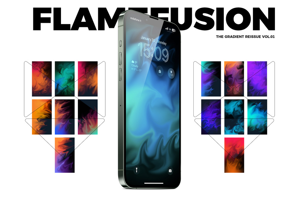 FlameFusion. A unique reissue of my best gradients resulted a wonder of coloured flames. Rotated dektop / Tablet versions included. The pack contains 14 wallpapers, all in 6K resolution.